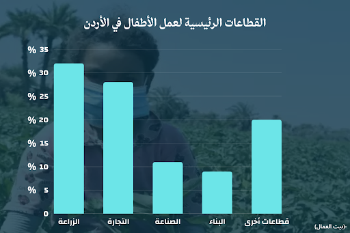 بحسب “التقرير السنوي حول أوضاع سوق العمل الأردني والحقوق العمالية 2024″، الصادر عن المركز الأردني لحقوق العمال (بيت العمال)، فإن الأطفال في الأردن ينشطون في عدة قطاعات رئيسية، يصعب ضبطها رقابياً، يأتي في مقدمتها قطاع الزراعة، يليه قطاع التجارة، ومن ثم قطاعي الصناعة والبناء على التوالي.