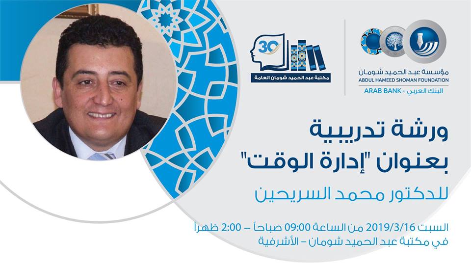 تُقيم مكتبة عبد الحميد شومان العامة فرع الأشرفية، ورشة تدريبية بعنوان (إدارة الوقت) للدكتور محمد السريحين، وذلك يوم السبت 16 آذار 2019 من الساعة 9 صباحاً حتى 2 ظهراً في مكتبة عبد الحميد شومان.