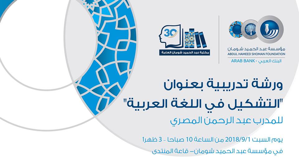 تُقيم مكتبة عبد الحميد شومان العامة ورشة تدريبية بعنوان (التشكيل في اللغة العربية) للمدرب عبد الرحمن المصري يوم السبت 1 أيلول المقبل من الساعة 10 صباحاً وحتى 3 ظهراً في مؤسسة عبد الحميد شومان- قاعة المنتدى.